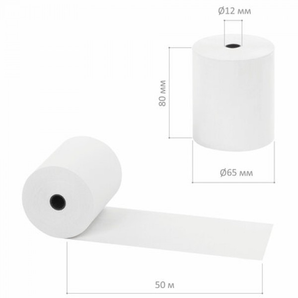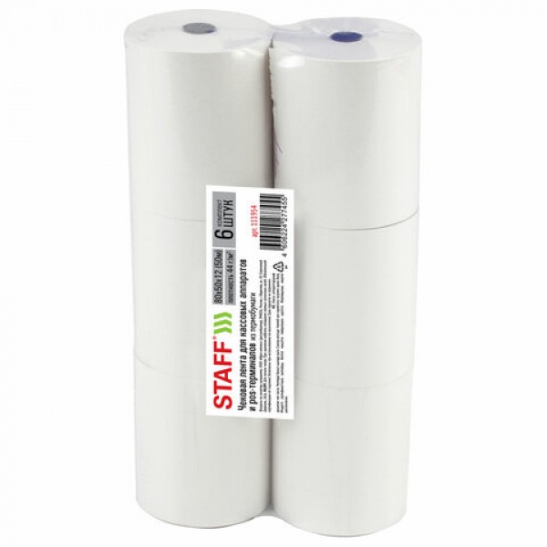 Чековая лента ТЕРМОБУМАГА 80 мм (диаметр 65 мм, длина 50 м, втулка 12 мм), КОМПЛЕКТ 6 шт., 44 г/м2, STAFF, 111954
