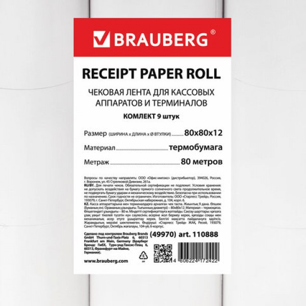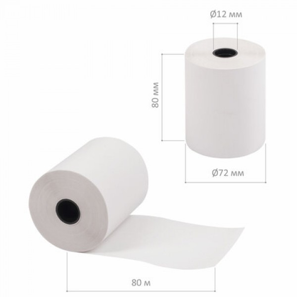 Чековая лента ТЕРМОБУМАГА 80 мм (диаметр 72 мм, длина 80 м, втулка 12 мм) КОМПЛЕКТ 9 шт., BRAUBERG, 110888