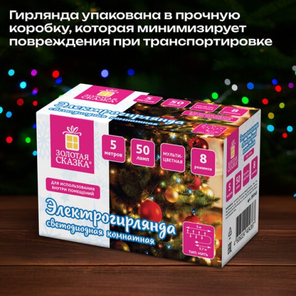 Электрогирлянда-нить комнатная 'Стандарт' 5 м, 50 LED, мультицветная, 220 V, контроллер, ЗОЛОТАЯ СКАЗКА, 591345
