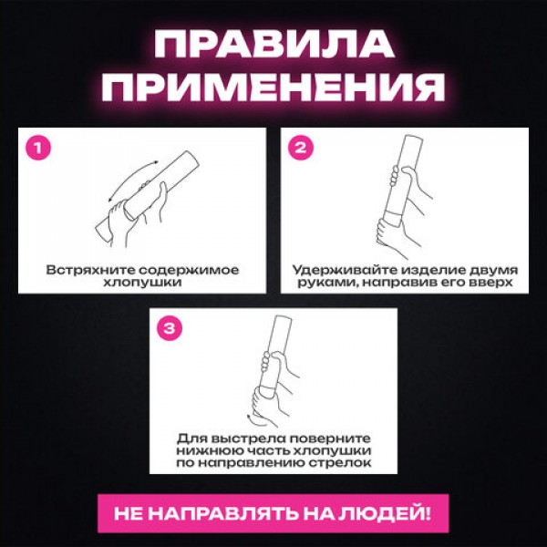 Пневматическая хлопушка не является пиротехникой и работает на основе энергии сжатого воздуха. Конфетти и серпантин ярких цветов можно использовать в помещении или на улице. Хлопушка подойдет для праздников, концертов, реквизита для фотосессии.