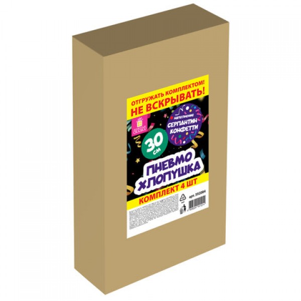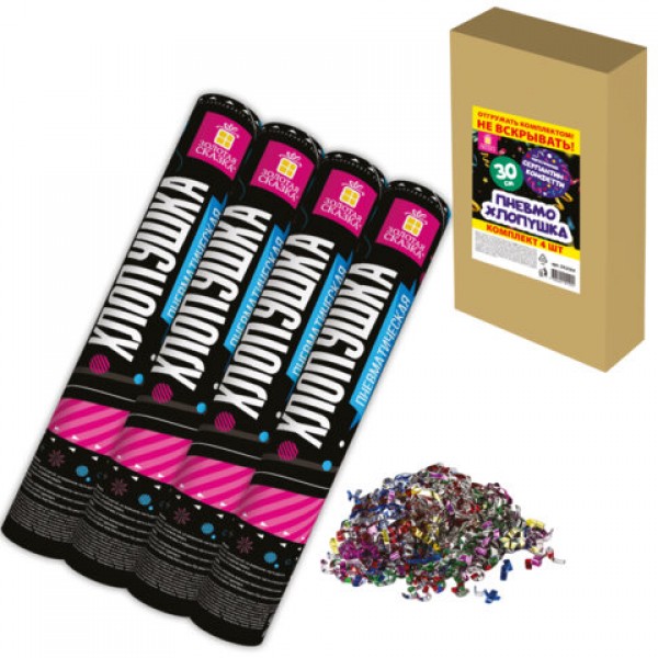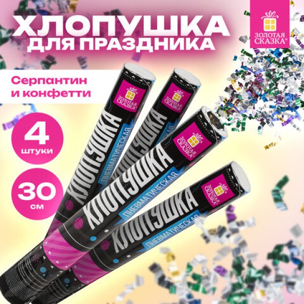 Хлопушка пневматическая 30 см 'Серпантин' 3+1 шт. В ПОДАРОК, фольга разноцветная, ЗОЛОТАЯ СКАЗКА, 592084