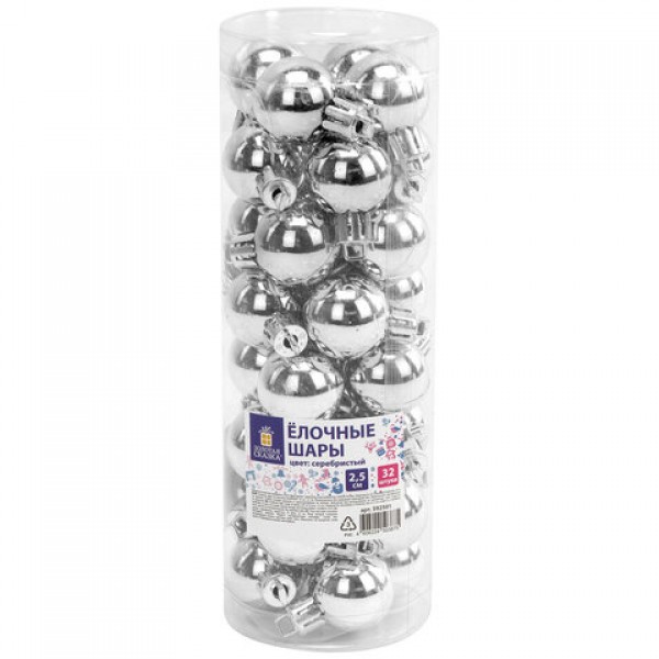 Шары ёлочные 32 шт., 2,5 см, 'Tender Shine', пластик, серебристые, глянец, ЗОЛОТАЯ СКАЗКА, 592501
