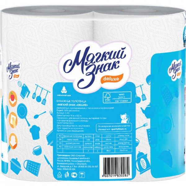 Полотенца бумажные бытовые, спайка 2 шт., 2-х слойные (2х10 м), МЯГКИЙ ЗНАК Deluxe, белые, С40