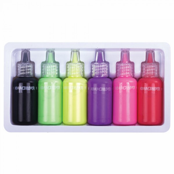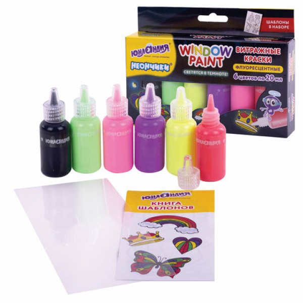 Краски витражные ЮНЛАНДИЯ 'НЕОНЧИКИ', 5 цветов светящихся в темноте + 1 черный, 20 мл, шаблоны, 191760