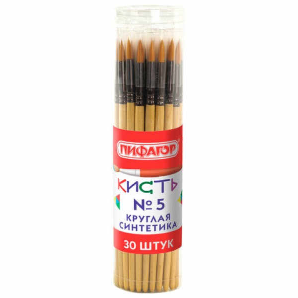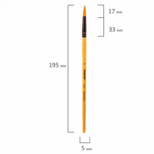 Кисть ПИФАГОР, СИНТЕТИКА, круглая, № 5, деревянная лакированная ручка, с колпачком, 200845