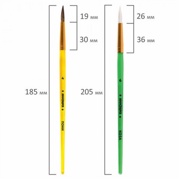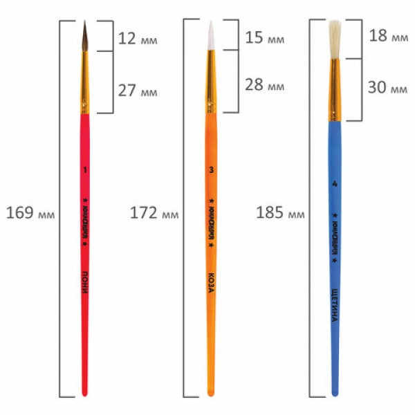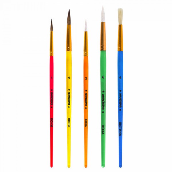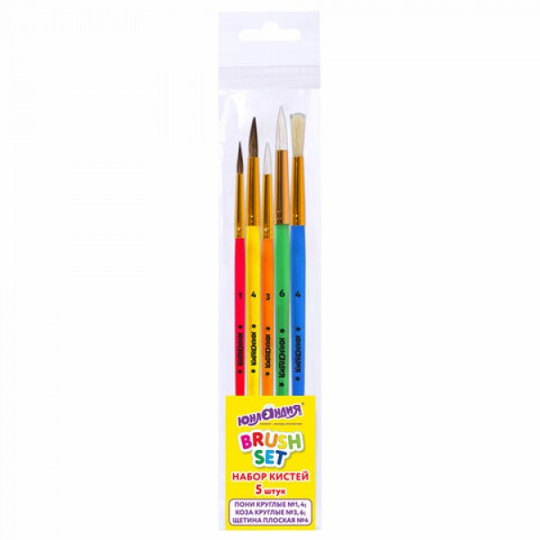 Кисти НАБОР 5 шт. (ПОНИ круглые № 1, 4; КОЗА круглые № 3, 6; ЩЕТИНА плоская № 4), пакет, ЮНЛАНДИЯ, 201079