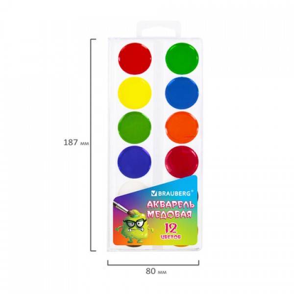 Краски акварельные BRAUBERG 'МОНСТРИКИ', медовые, 12 цветов, круглые кюветы, 192641