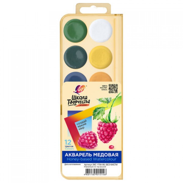 Краски акварельные изготовлены на основе органических пигментов и натурального связующего с добавлением пчелиного мёда. Предназначены для детского творчества и различных живописных работ. Отличаются хорошей прозрачностью, яркостью и чистотой цвета.