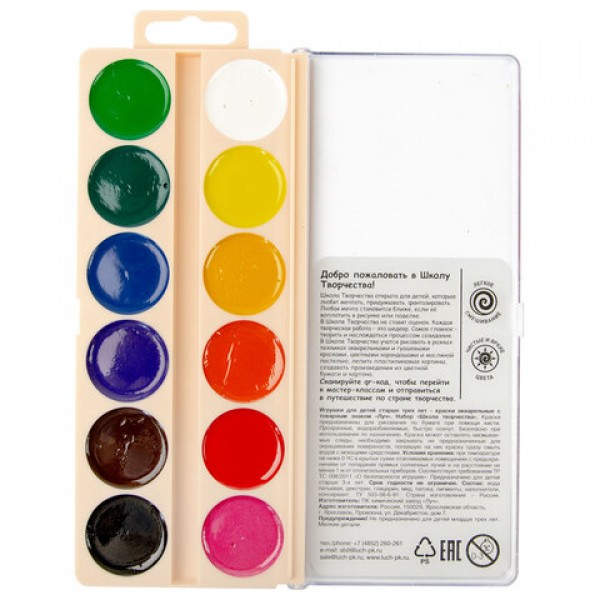 Краски акварельные ЛУЧ 'Школа творчества', 12 цветов, медовые, без кисти, пластиковая коробка, 29С 1756-08