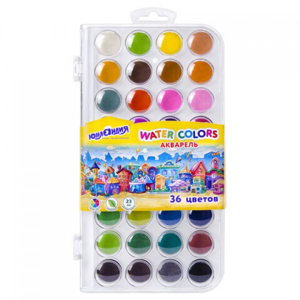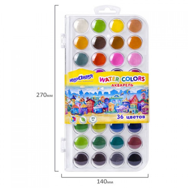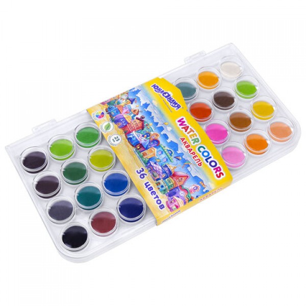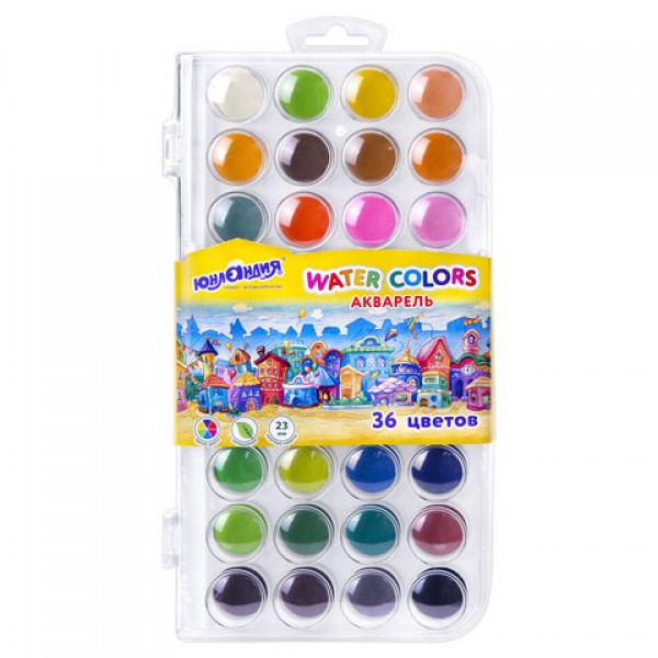 Краски акварельные ЮНЛАНДИЯ 'ДОМИКИ', 36 цветов, круглые кюветы 23 мм, пенал, 192633