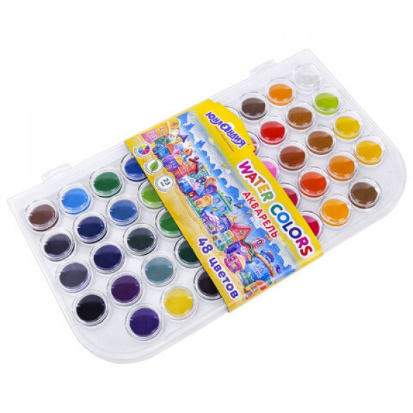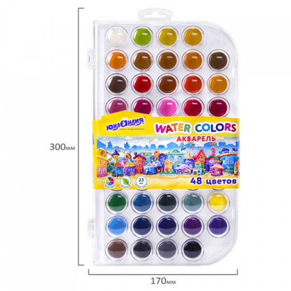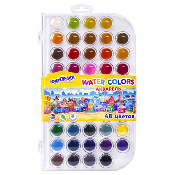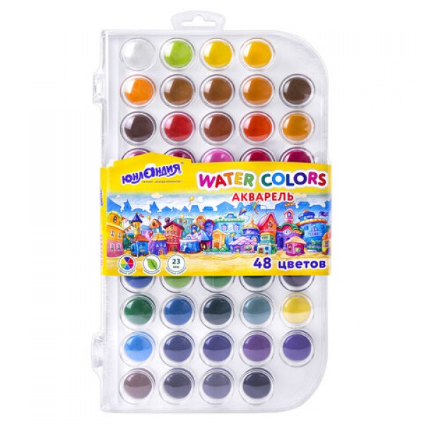 Краски акварельные ЮНЛАНДИЯ 'ДОМИКИ', 48 цветов, круглые кюветы 23 мм, пенал, 192634
