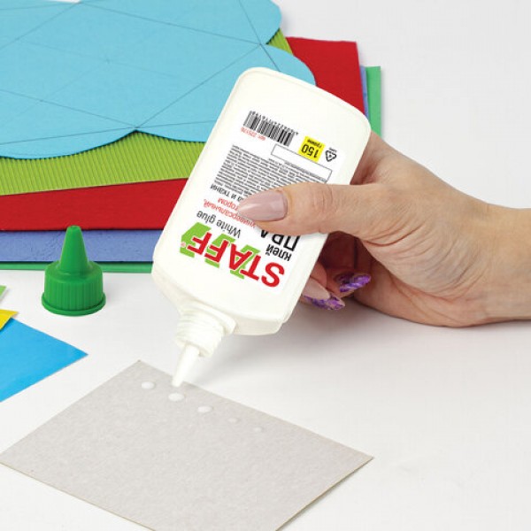 Клей ПВА STAFF применяется для склеивания бумаги, картона, фотографий, дерева.
