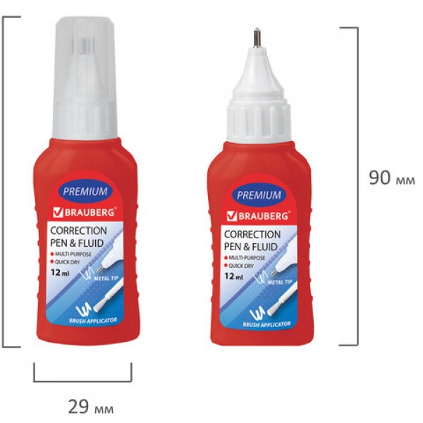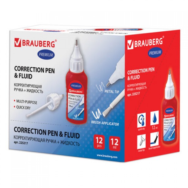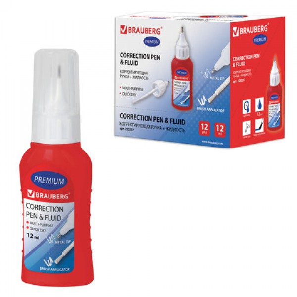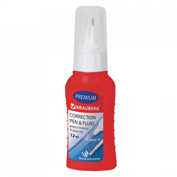 Ручка-корректор + корректирующая жидкость BRAUBERG, 12 мл, 2 в 1: металлический наконечник + кисточка, 225217