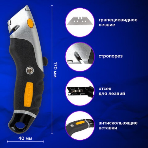 Универсальный мощный нож с автофикстором BRAUBERG "Heavy duty M" – инструмент, который поможет при резке бумаги, пластика, картона и прочих плотных и вязких материалов: линолеума, гипсокартона, ковролина.